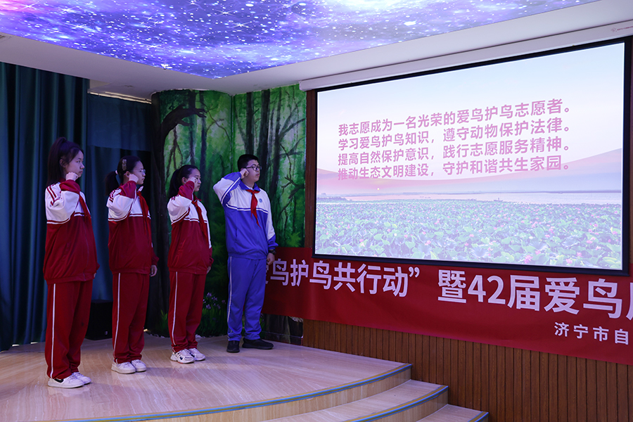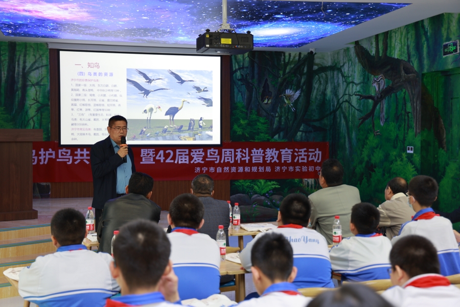 爱鸟周是中国为保护鸟类、维护自然生态平衡而面向社会开展的一项大型公益宣传活动,山东省根据候鸟回归的时间,将每年4月23日至29日确定为全省的“爱鸟周”。本次活动以党的二十大精神为引领,紧紧围绕今年的主题“保护候鸟迁徙通道,推进生态文明建设”,结合新修订的《中华人民共和国野生动物保护法》,野生动物保护专家带领师生代表实地观看鸟类、野生动植物标本,向师生们普及湿地、森林及野生动物相关知识,学生代表宣读《济宁市第42届“爱鸟周”宣传活动倡议书》,向全社会发出了争做爱鸟护鸟守法员、宣传员、监督员和救护员的倡议,着力营造全民参与共同保护鸟类及其栖息地的良好社会氛围,全力以赴推进生态文明建设迈上新台阶,为美丽中国建设贡献智慧和力量。