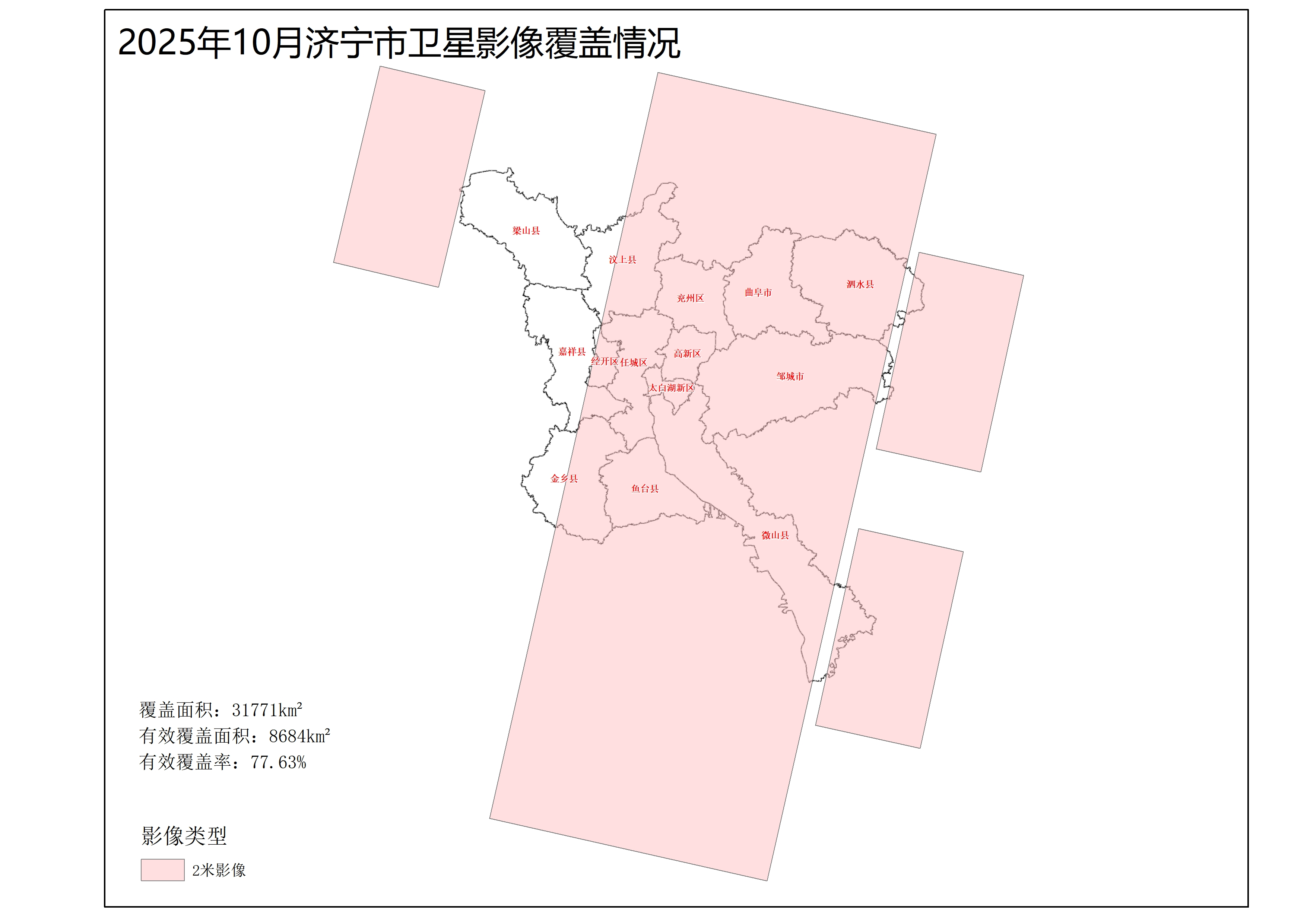 2025年10月份,共获取遥感影像31771平方千米,有效覆盖面积8684平方千米,有效覆盖率77.63%(济宁市市域面积11187平方千米)。其中: