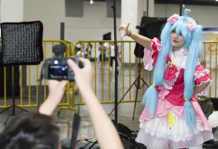 在上海举行的2025年中国国际动漫游戏博览会上,扮装者在摄影区拍照(7月4日摄)。新华社记者 王翔 摄