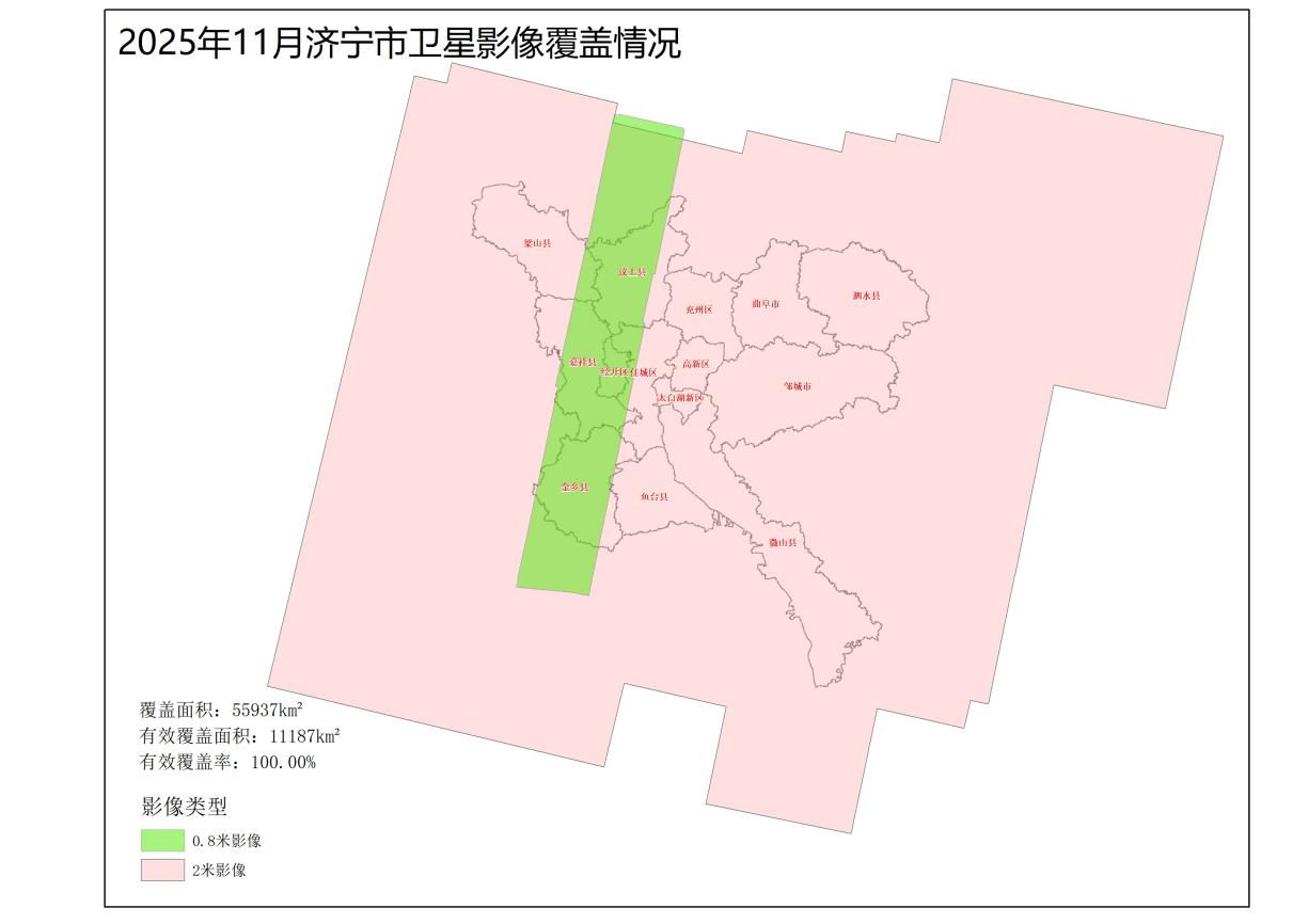 2025年11月份,共获取遥感影像55937平方千米,有效覆盖面积11187平方千米,有效覆盖率100.00%(济宁市市域面积11187平方千米)。其中: