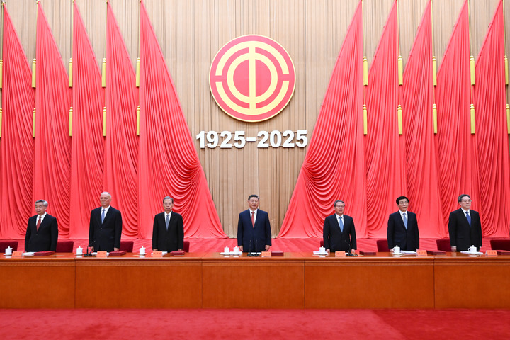 人民大会堂大礼堂气氛隆重热烈。主席台上方悬挂着“庆祝中华全国总工会成立100周年暨全国劳动模范和先进工作者表彰大会”会标,后幕正中悬挂中国工会会徽,会徽下方是“1925-2025”字标,10面红旗分列两侧。二楼眺台悬挂着标语:“以习近平新时代中国特色社会主义思想为指导,坚定不移听党话跟党走,在以中国式现代化全面推进强国建设、民族复兴伟业中充分发挥工人阶级主力军作用和工会桥梁纽带作用!”