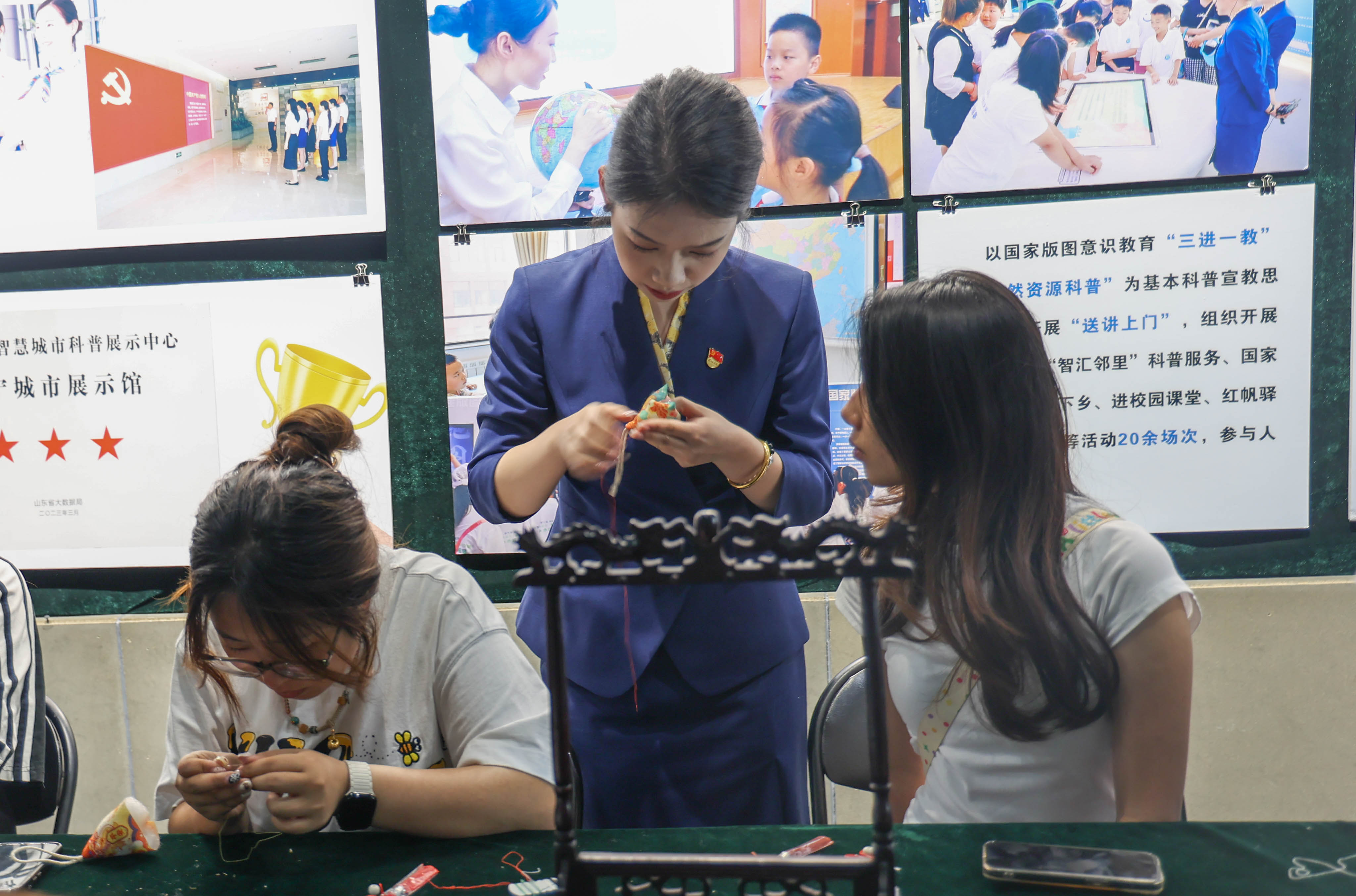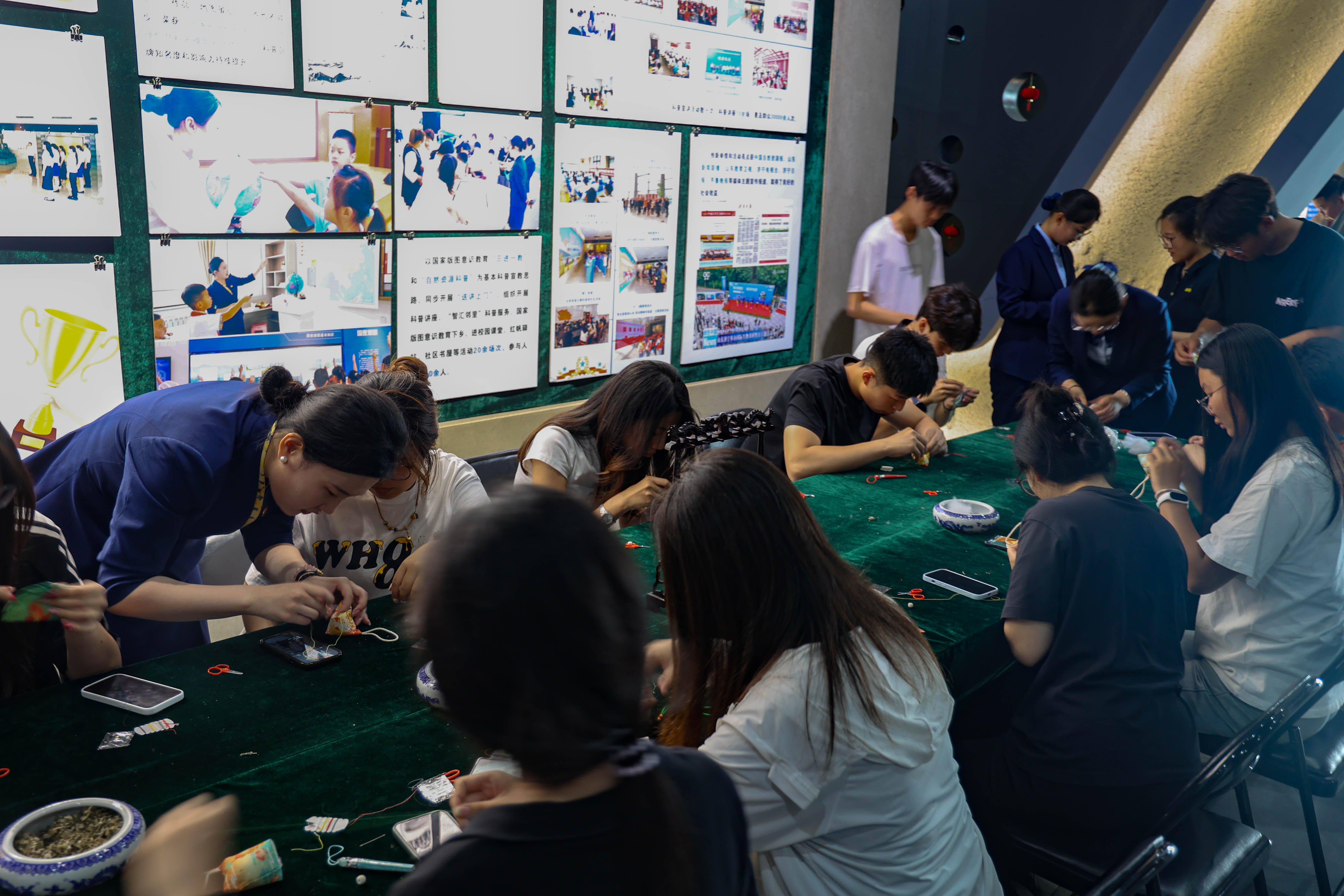 恰逢世界环境日临近,宣讲团队巧妙结合节日契机,为青年学子们带来了生动的自然资源知识科普,引导青年思考传统文化中蕴含的可持续发展,为活动奠定了“古今对话、绿色传承”的基调。步入展示馆,通过3D影院、图文写真、数字沙盘等现代化展陈手段,沉浸式了解了济宁深厚的文化底蕴和“现代新城”的规划蓝图。在城市讲堂内,从屈原精神、龙舟竞渡到香囊驱疫,解读了节日背后深厚的家国情怀与民俗智慧。移步至民俗文化展厅,瞬间变身为热闹的传统手作坊,青年学子兴致盎然地体验香囊制作与五彩绳编织,馆内洋溢着传统文化与青春活力交融的动人气息。