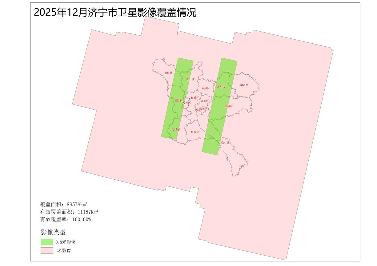 2025年12月份,共获取遥感影像88578平方千米,有效覆盖面积11187平方千米,有效覆盖率100.00%(济宁市市域面积11187平方千米)。其中: