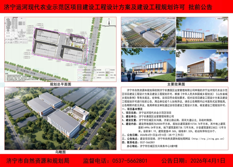 济宁运河现代农业示范区项目建设工程设计方案及建设工程规划许可 批前公告