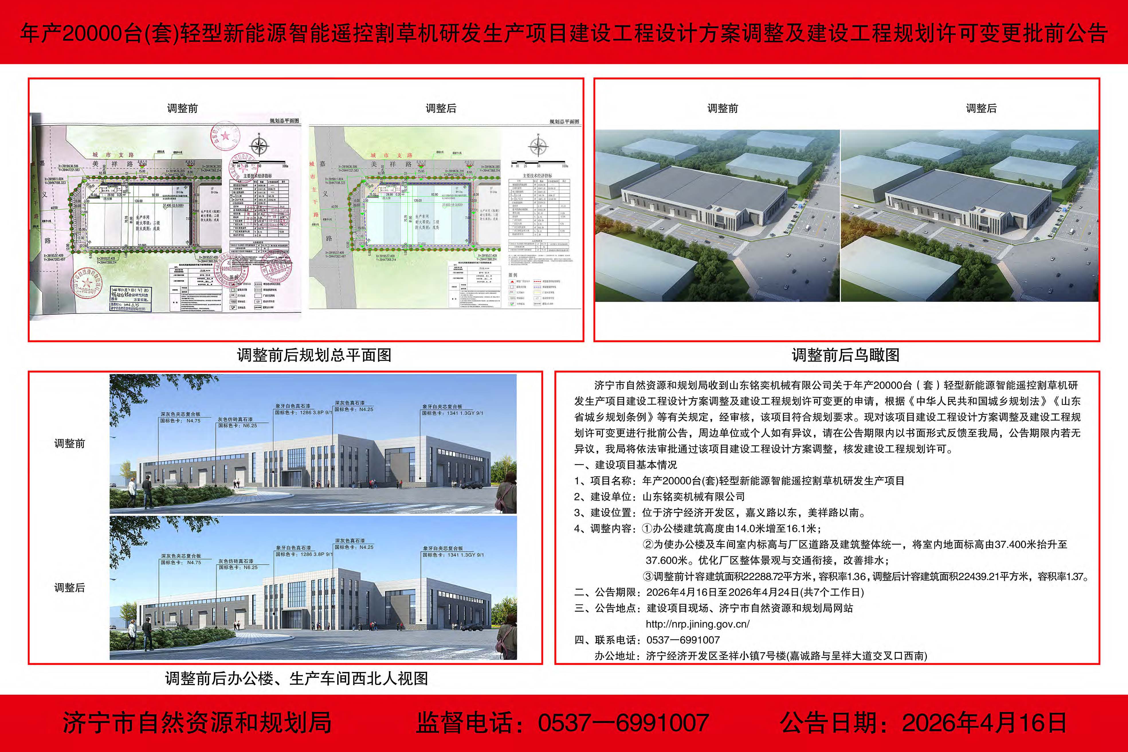 年产20000台(套)轻型新能源智能遥控割草机研发生产项目建设工程设计方案调整及建设工程规划许可变更批前公告